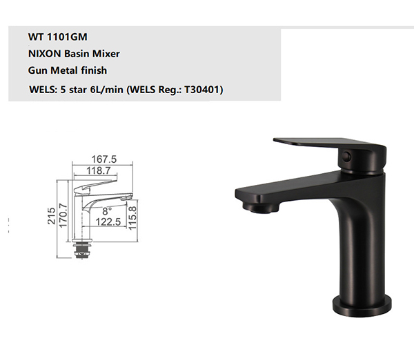 NIXON-II Basin Mixer, WELS Rating:5 star 5L/min, WELS Reg. No: T34896