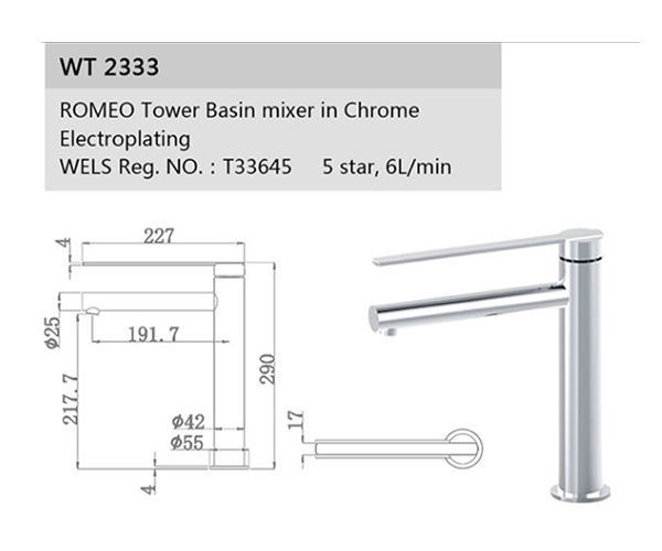 ROMEO Tower Basin Mixer, WELS Rating:5 star 6L/min, WELS Reg. No: T33645