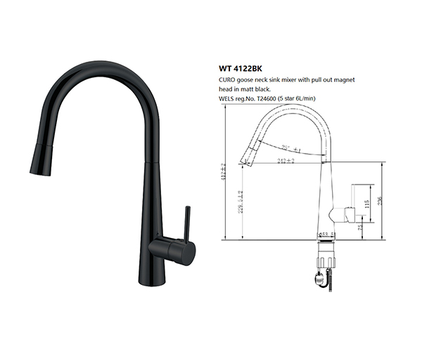CURO Goose Neck Sink Mixer w/Pull out Magnetic Head Matte Black finish,WELS Reg. No: T24600