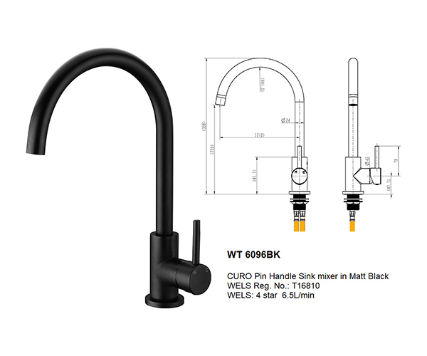 CURO Pin Handle Sink Mixer Matte Black finish,WELS Reg. No: T16810