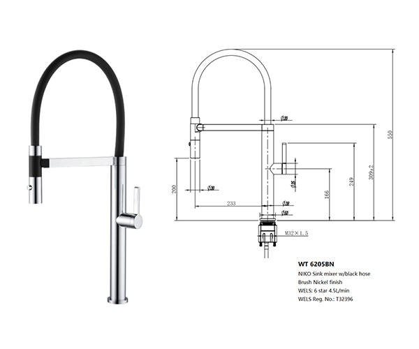 NIKO Sink Mixer w/Black Hose in Brushed Nickel,WELS Reg. No: T32396