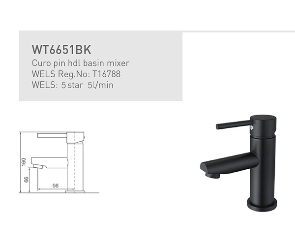 CURO Pin Handle Basin Mixer Matte Black finish,WELS Reg. No: T16788